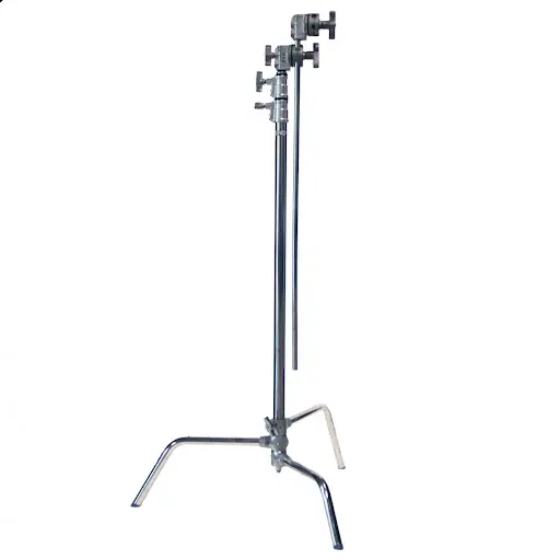 Ceferino no desmontable de acero cromado. Cuenta con una base de 3 patas, con una regulable y una columna central de 3 secciones con dos bloqueos. Llega a una altura máxima de 305 cm y soporta una carga máxima de 10 kg. Incluye en la parte superior una espiga de 16mm estándar, compatible con una gran cantidad de paneles, luces y artículos de estudio.